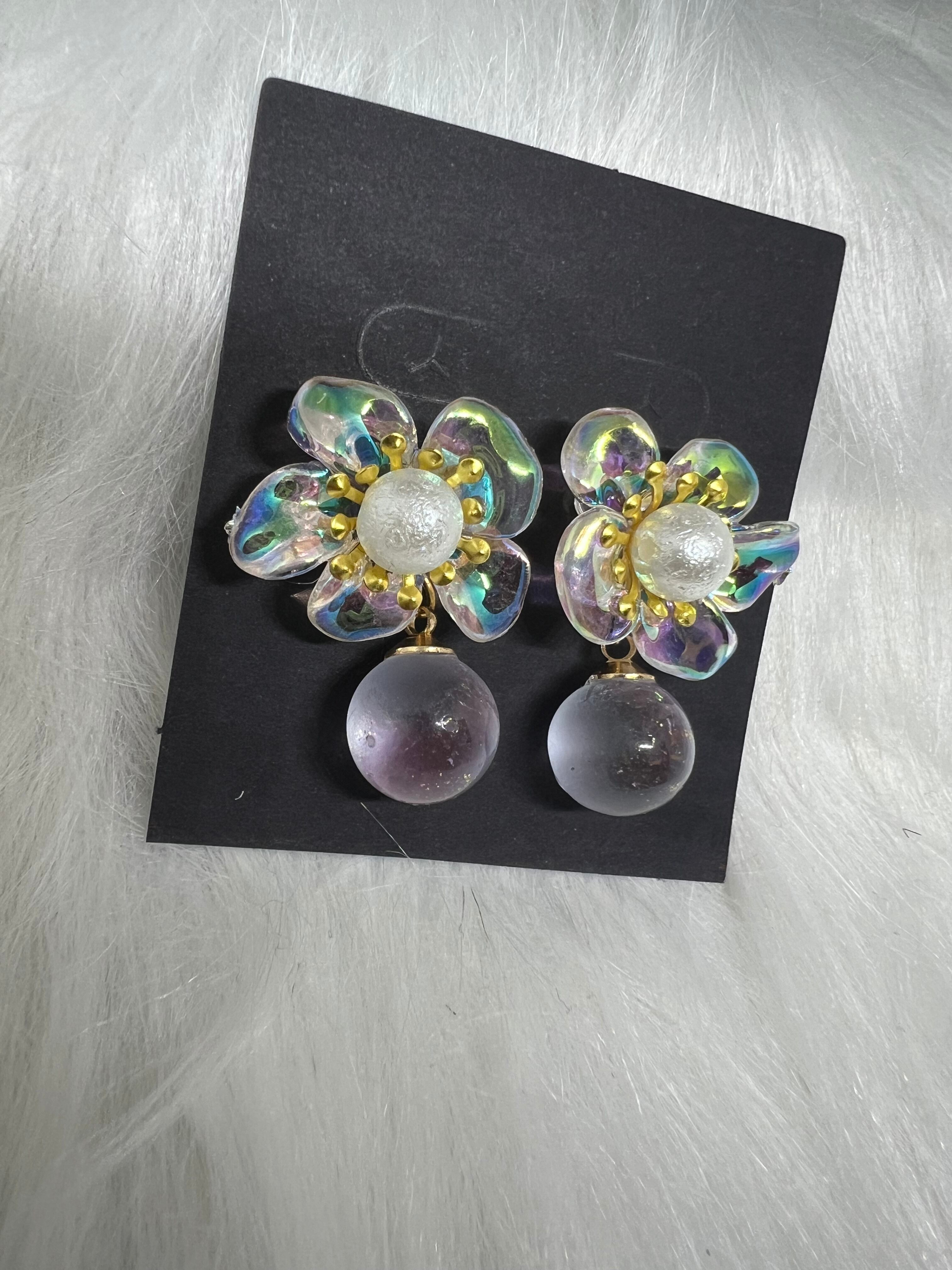 コットンパールがアクセントのお花✿॰ॱ 角度によって色が変わるチャームが ゆらゆらと揺れて可愛いです◎