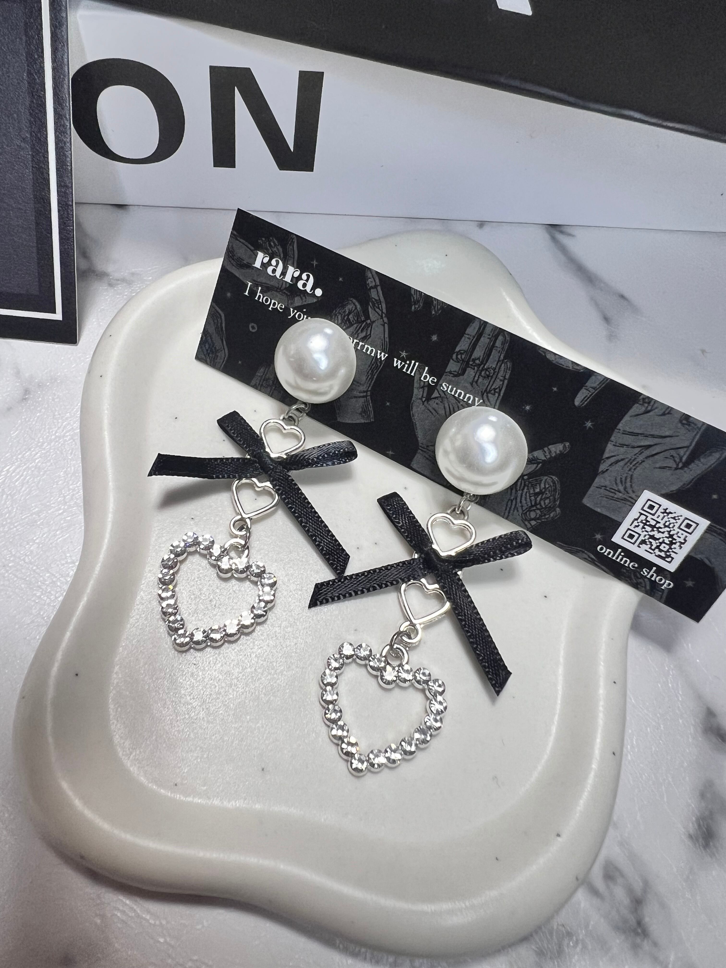 パールのカボションが上品◎ 黒いリボンとキラキラ光るハートのチャームが 相性抜群♡